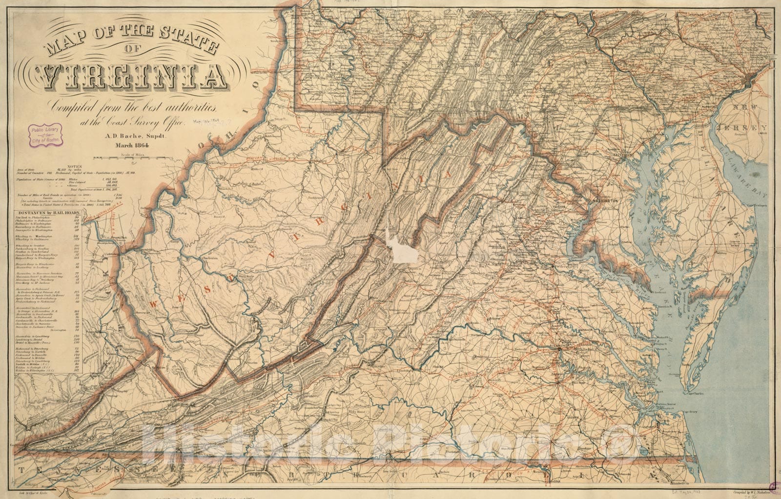 Historical Map, 1864 Map of The State of Virginia, Vintage Wall